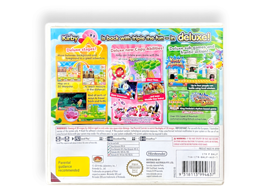 Excellent Condition & 100% Complete with Contents: KIRBY TRIPLE DELUXE for NINTENDO 3DS. This game is a very tidy and complete collector’s item, and in the Official New Zealand Print with the signature PG Classification embedded in the cover art. Add this to your collection today.