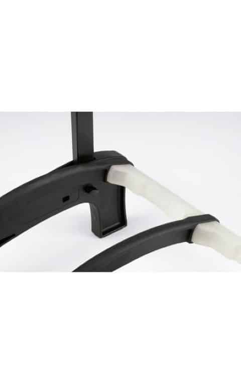 The “Guardian” holds 5 guitars securely, saves space and allows you an easy overview of your guitars. Ideal for use in the studio, on stage in a shop or at home. No matter whether you have acoustic, electrical or bass guitars, the special instrument-compatible supports protectively hold max. 5 guitars. The protective bars stop the guitars from rotating and prevent inadvertent removal or knocks or bumps when taking the guitars from the stand or placing them. The soft pads made of high quality thermoplastic elastomer have cushioning characteristics. Therefore they protectively take the weight of the guitar and avoid damages of the instrument. The innovative folding mechanism used on the “Guardian” allows the stand to be carried easily and it can be left standing upright. Highly flexible, sub-divided support arms with integrated pick holders mean the guitar can be held from either side (right or left) and that the strings are untouched. The structural design allows the “Guardian” to be positioned against a wall. The “Guardian” is available entirely in black or with translucent?(colorless) elements made of high quality Elastomer plastic,?which?are suitable for all kind of guitar lacquers, including nitro lacquer. Discoloration from the stand to the guitar does not occur.