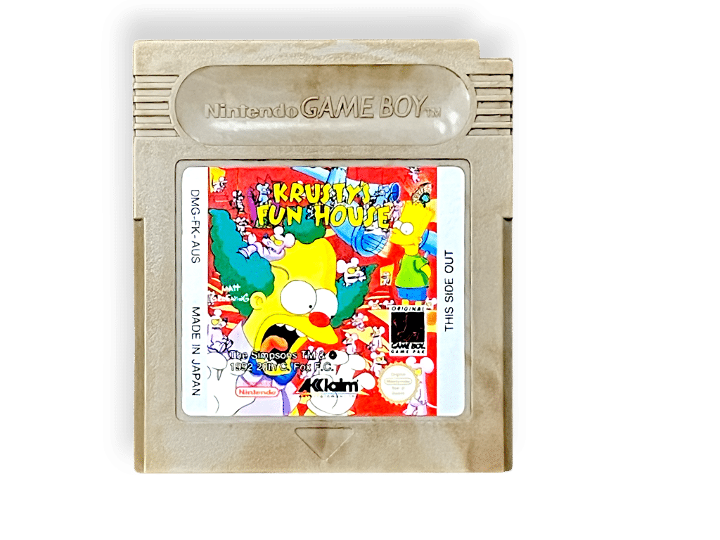 Krusty’s Fun House (Game Boy). This pre-owned Nintendo Game Boy game cartridge (Gameboy game) is in good condition with some discolouration to the plastic as a purely cosmetic imperfection. Refer photographs. Note that the original box is not included here, this is the cartridge only.