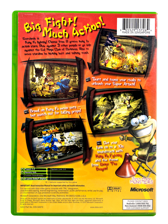 Kung Fu Chaos” allows up to four people to battle it out on huge interactive movie sets that provide an added challenge to the mayhem. In true Hong Kong style, the combat features over-the-top gigantic leaps, suicidal stunts and multiple-opponent action. Gamers can choose from an outrageous cast of characters, each with unique brawling capabilities.