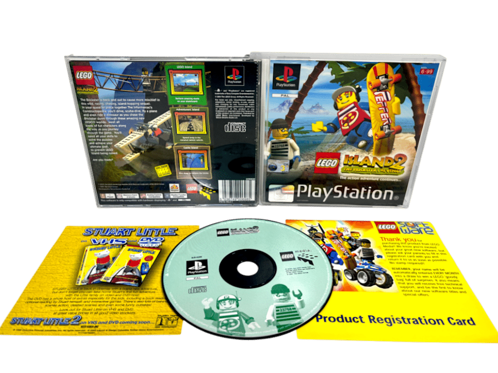 LEGO ISLAND 2 THE BRICKSTER’S REVENGE for SONY PLayStation 1 / PS1. This preowned game is in very good condition and includes case + front cover + back cover + 2 x internal promo cards + game disc. The game manual is not included in this listing, but the game is self-explanatory, and the instructions are readily available online.
