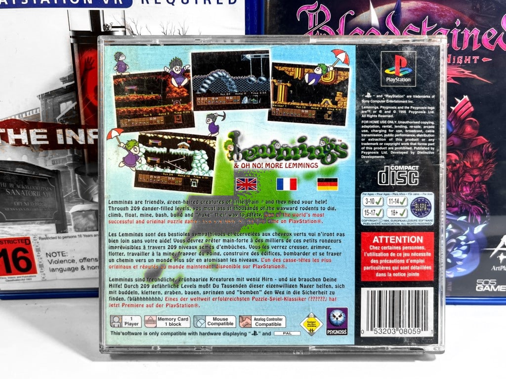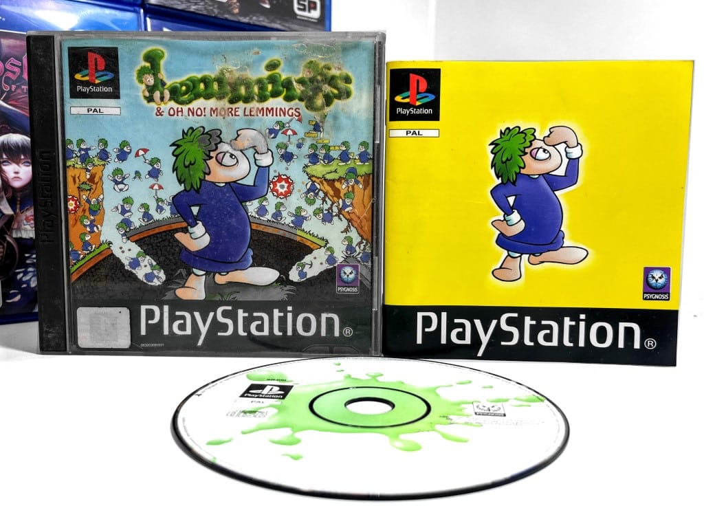 Excellent condition & 100% complete with contents: LEMMINGS Oh No More Lemmings for SONY PlayStation 1 / PS1. This preowned game comes complete with each of the covers (both front and reverse cover slips) + manual / booklet + game disc in Excellent condition. Case has the remains of original price stickers on the front, but this is a minor imperfection which can be removed.