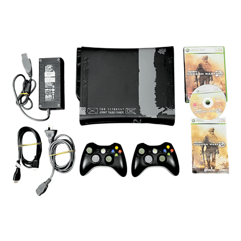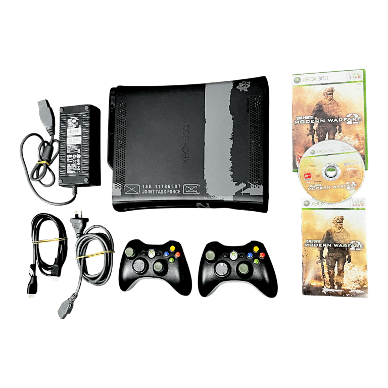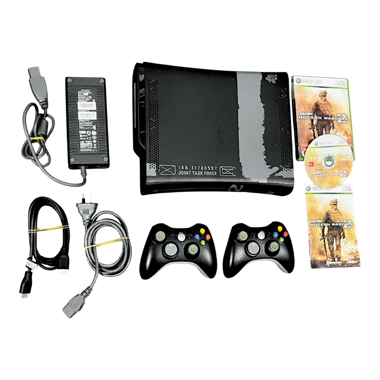 Rare Official LIMITED EDITION CALL OF DUTY MODERN WARFARE 2 Xbox 360 Console 250GB with TWO Official Microsoft Xbox 360 Controllers, AC Power Adapter, HDMI Lead, Power Lead, and Call of Duty Modern Warfare II the game in good condition with mild scratches only, and complete with manual. This preowned console is in good condition and perfect working order. Both controllers are in very good condition also. I noticed that one of the controllers inside the battery compartment I spotted a rusted spring, so this controller will likely need this spring either sanded or replaced . Authentic Limited Call of Duty Hardware. A highly sought after collector’s console. Refer photographs.