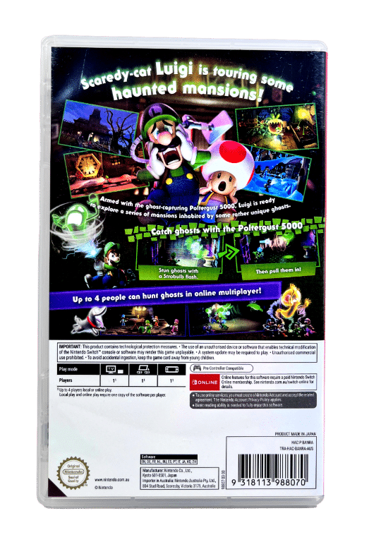 Progress through diverse missions to retrieve the missing shards of the Dark Moon scattered across several distinct haunted mansions, each with their own puzzles to solve and ghosts to capture. Go for a high rating by using your superpowered ghost-hunting tool, the Poltergust 5000, to suck up ghosts (and window curtains) and blow air to search every nook and cranny of the chilling-yet-charming mansions. This spooky fun adventure, originally released for the Nintendo 3DS™ system, is now visually enhanced in HD on the Nintendo Switch™ system.