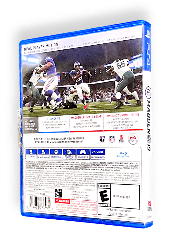 Excellent Condition & 100% Complete with contents: Madden NFL 19 / MADDEN 19 / MADDEN 2019 / MADDEN 2K19 for SONY PlayStation 4 / PS4. This preowned game is in good condition, and comes complete with case, cover, carded insert, and game disc. Genuine alternate for a US colour.
