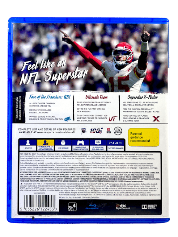MADDEN NFL ’20- for SONY PlayStation 4. This preowned game is in excellent condition and comes complete with case + cover + carded inserts + game disc.