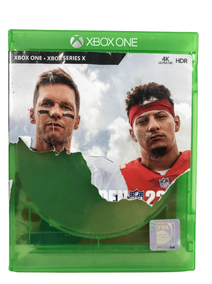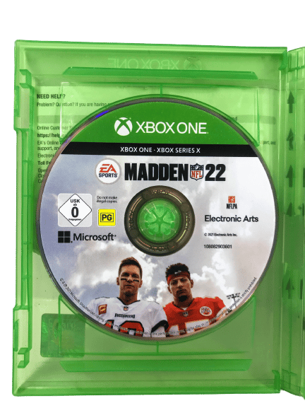 MADDEN NFL 22 for both Xbox One and XBox Series X. This preowned game disc is in excellent condition, and includes case and both carded inserts. The case, disc, and carded inserts are each in excellent condition. The paper cover is torn as pictured – please refer images 2 – 4.