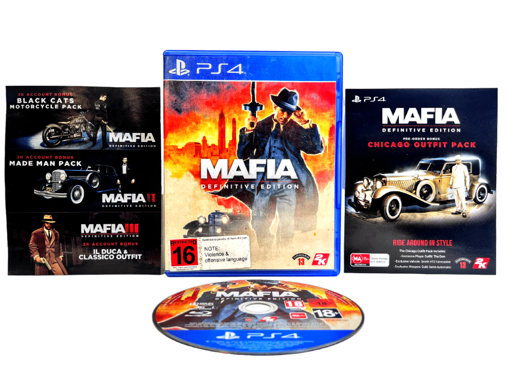 Excellent condition & 100% complete with carded inserts AND Poster: Mafia Definitive Edition for SONY PlayStation 4 / PS4. This preowned game disc is in excellent condition and includes accompanying case + cover + 2 x carded inserts + POSTER. Any single use paper voucher codes will have expired, but these were purely promotional and are not required for gameplay or completion. The full Mafia Definitive Edition game is included on the game disc.