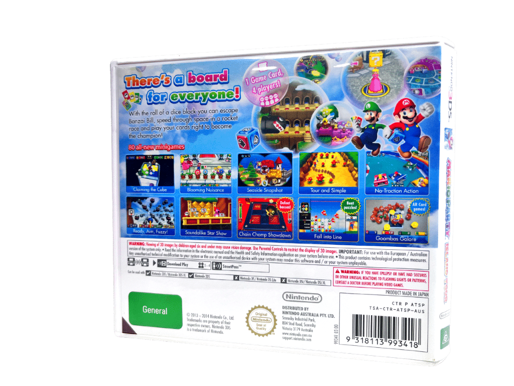 In this ultimate showdown you can take on the road blaze through the 7 new game boards, some of which take just minutes to play. Wrangle goombas and blast out of cannons as you tilt, tap, and draw through new minigames harnessing the unique functionality of Nintendo 3DS. Compete in new multiplayer modes including mind bending puzzles, minigame challenges, or enter a whole new reality with AR Card play for up to 4 players*. Whether in single or multiplayer, this is a portable party that never ends.