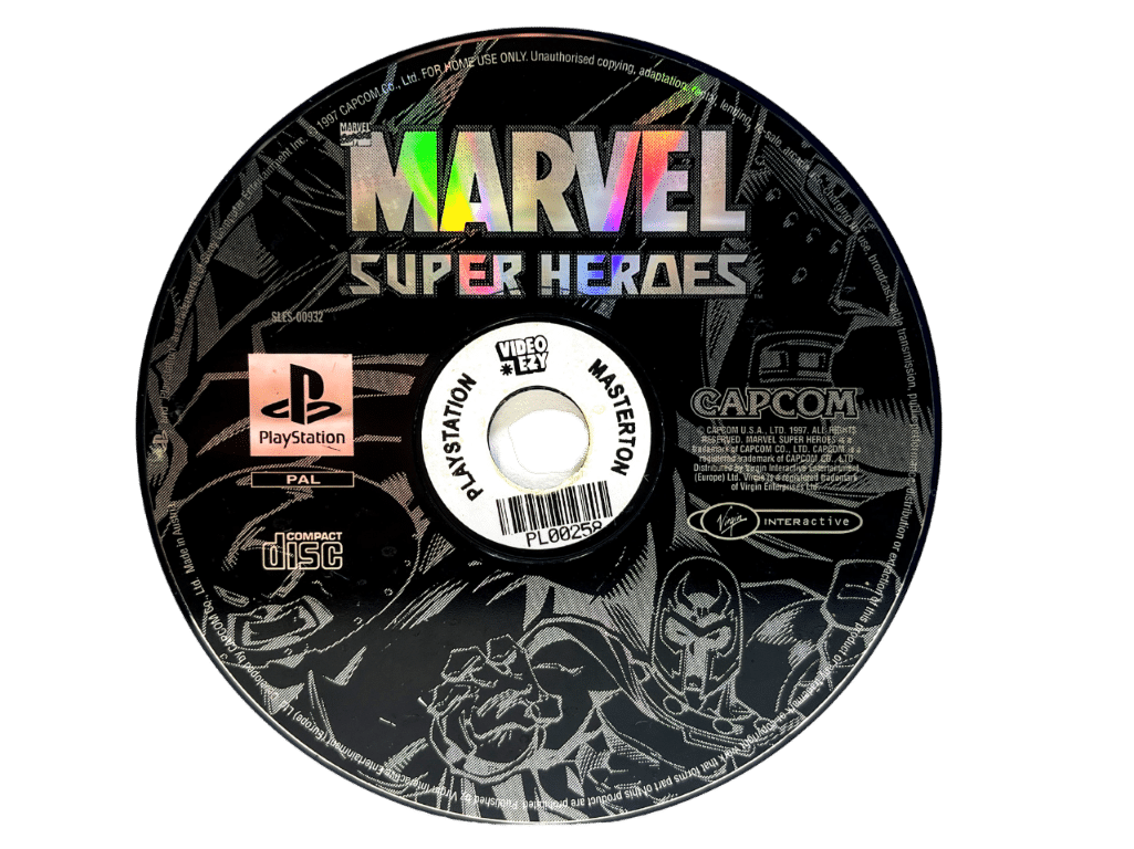 Marvel SuperHeroes / Marvel Super-Heroes for SONY PlayStation / PS1. This preowned game disc is in good condition with very mild markings and faint surface scratches only which do not affect gameplay or performance in the slightest (this game was purchased by one of our local retro collectors several months ago, played and then traded back into our store this week after the purchaser had finished playing the game still in the same condition that was originally sold to them in and still playing perfectly). Disc only comes inside empty blank case (original case NOT included).