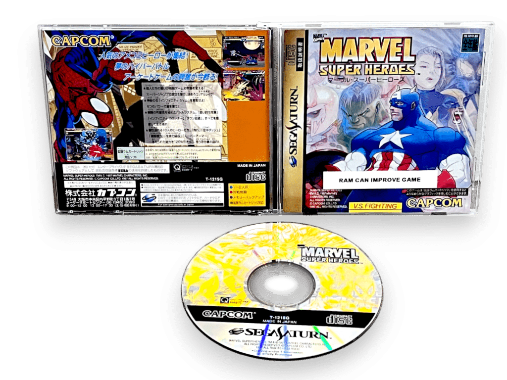 Marvel Super Heroes brings comic-book action to life with vibrant sprites, Infinity Gem mechanics, and explosive special moves. Players battle as iconic Marvel characters like Spider-Man, Hulk, and Captain America, each using unique gem-powered abilities. The Sega Saturn import version benefits from enhanced performance with RAM support, offering smooth animation and arcade-faithful gameplay. Highly regarded for its style and mechanics, this title is an essential piece of Capcom’s classic fighting game catalogue.