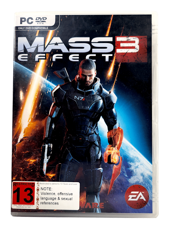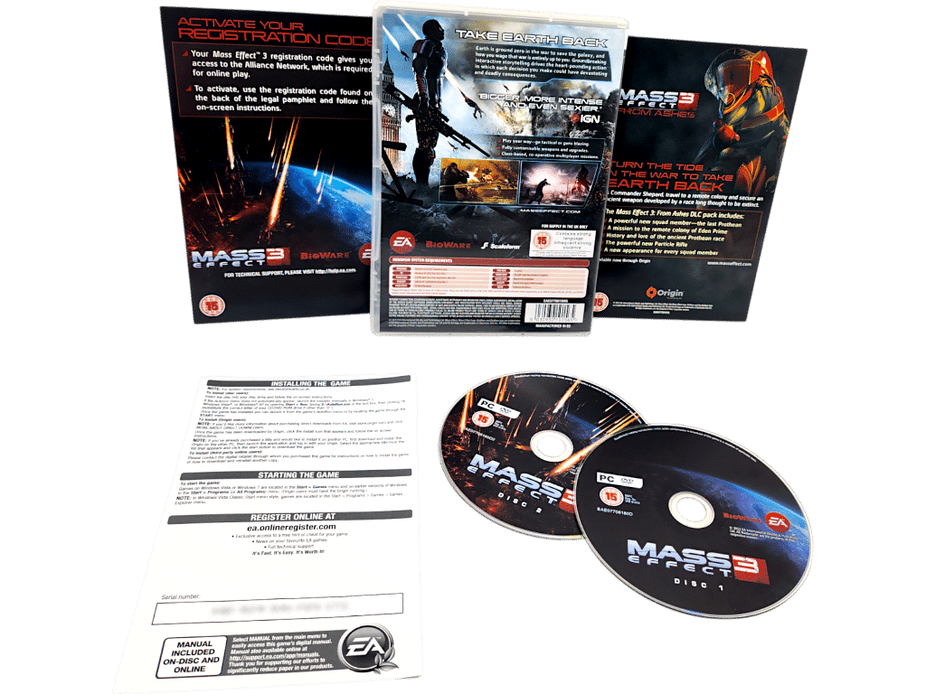 Excellent condition & 100% complete with contents: MASS EFFECT 3 for PC. This preowned game is in mint condition and complete with case + cover + manual / booklet + promo cards + 2 x game discs. A tidy collector’s item.