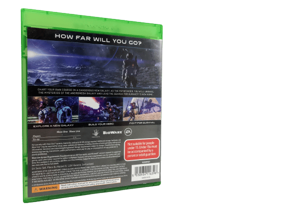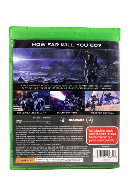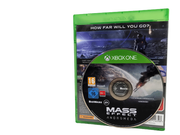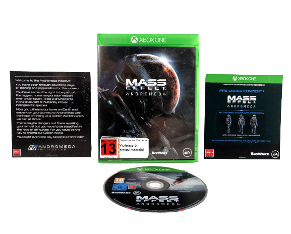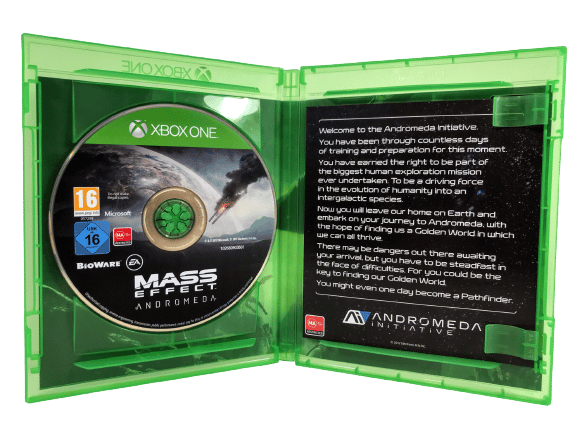 Excellent Condition & 100% Complete with contents: MASS EFFECT ANDROMEDA for XBox One. This preowned game is in superb condition and comes complete with case + cover + manual / booklet + promo card + game disc. Note that any single use paper voucher codes may or may not still be valid, but these were promotional downloads only and are not required for gameplay or completion. The full Mass Effect Andromeda game is included on the game disc.