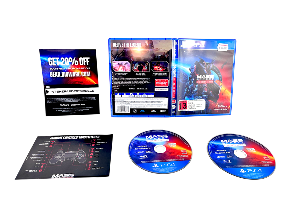 DESCRIPTION: This complete Mass Effect Legendary Edition includes the case, two discs, a combat controls guide, and a promotional insert. The collection remasters the entire original trilogy with improved visuals, performance, and modernised gameplay systems. Players follow Commander Shepard across three interconnected games, making choices that shape relationships, alliances, and the fate of the galaxy. With over 40 DLC packs included, this edition offers hundreds of hours of content. The improved textures, lighting, and quality‑of‑life updates make it the definitive way to experience the series. A premium collectible for RPG fans and long‑time Mass Effect enthusiasts.