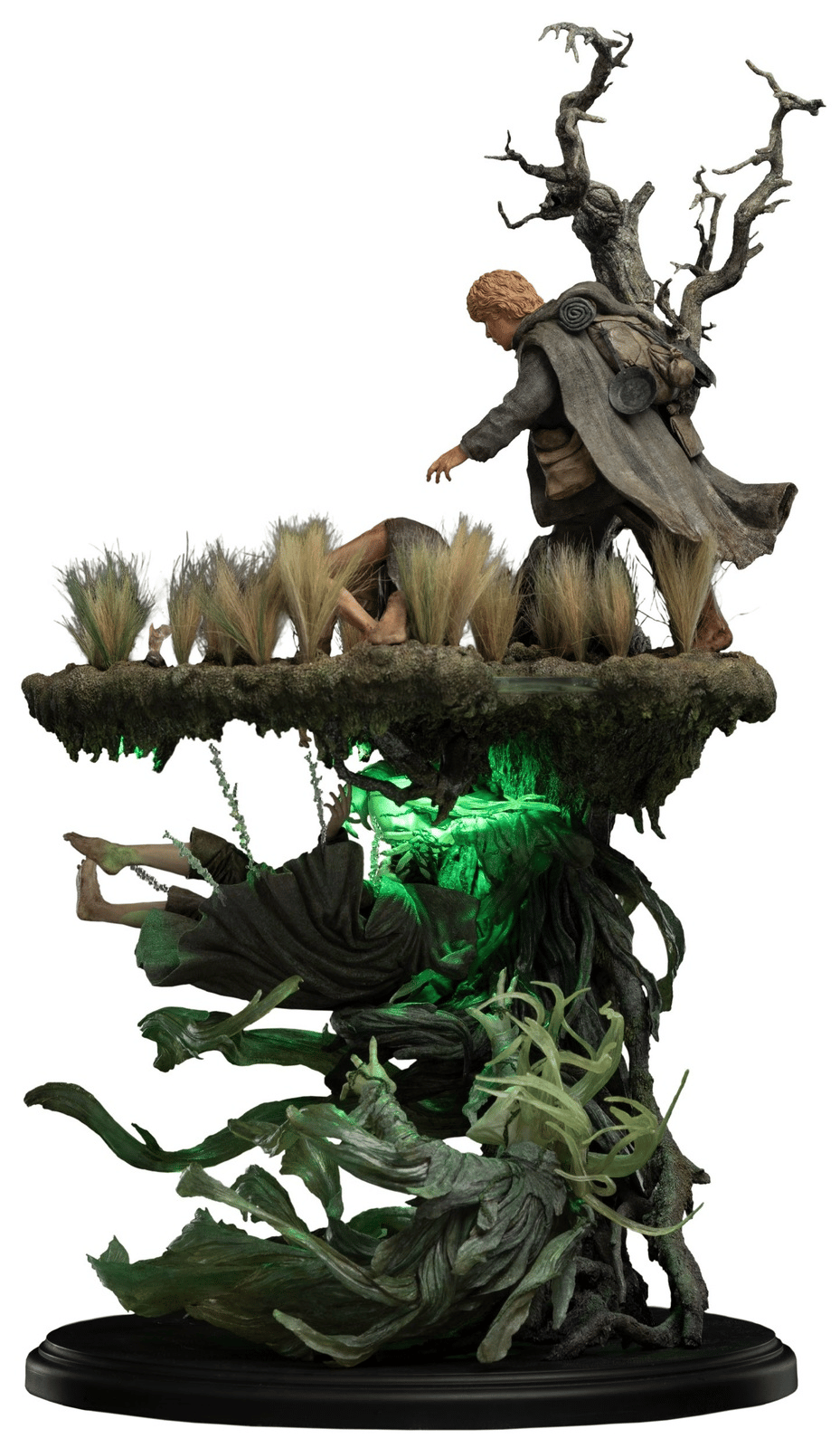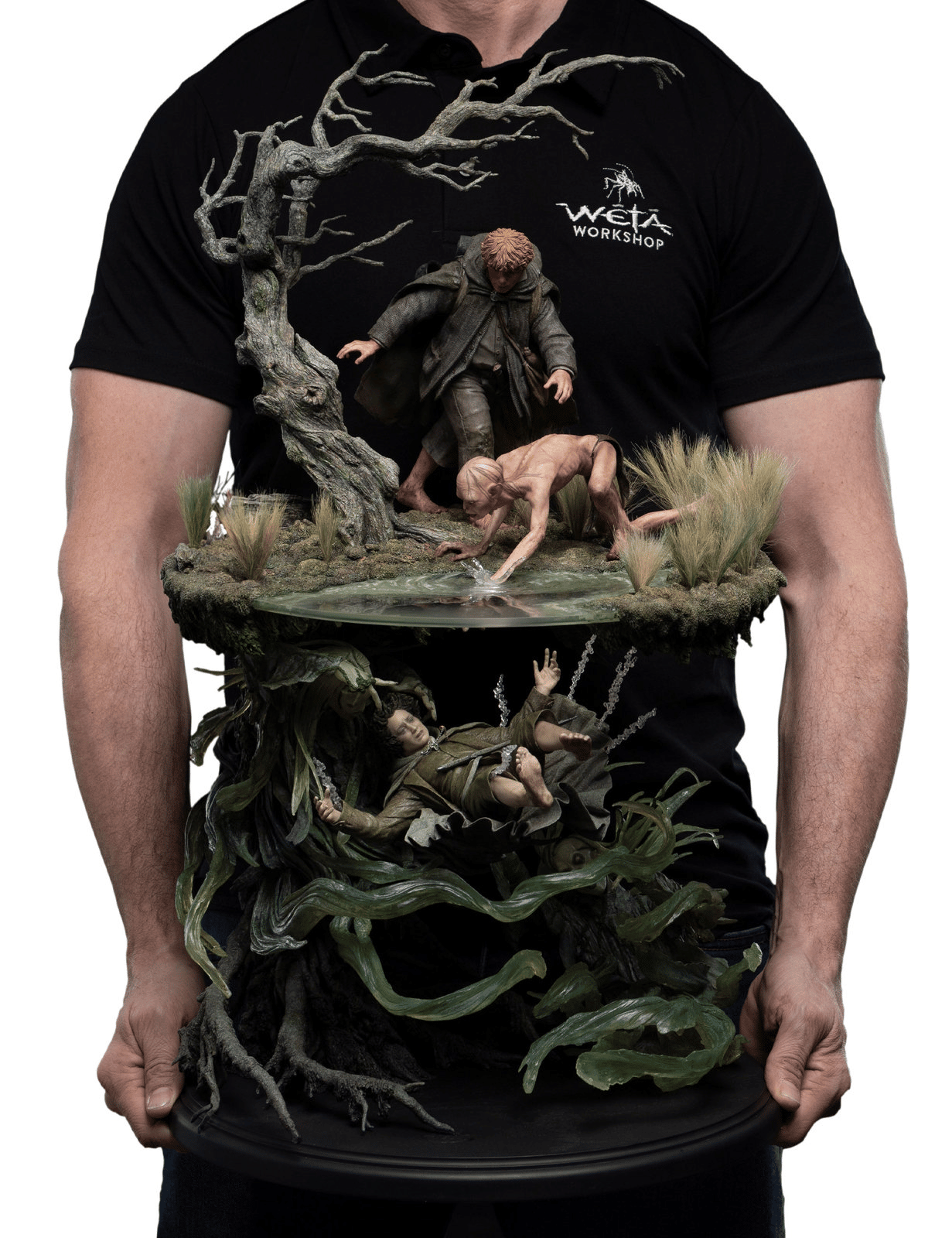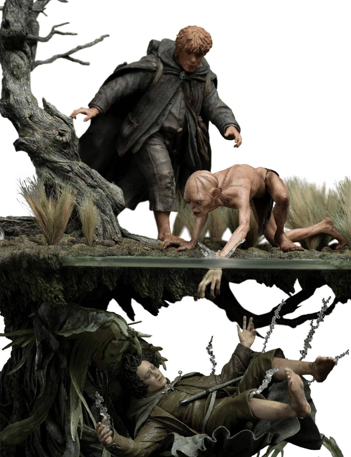 Capitalizing on the environment’s mystical nature, and undead spirits haunting the waters below, we wanted to display the two worlds that often overlap in Middle-earth: the magical and the mundane. Above the waters, Sam and Gollum desperately reach out to rescue the sinking Hobbit. Below the waters, wraiths pull Frodo further into the depths. Representing those two contrasting worlds in one scene proved pivotal in creating this collectible.