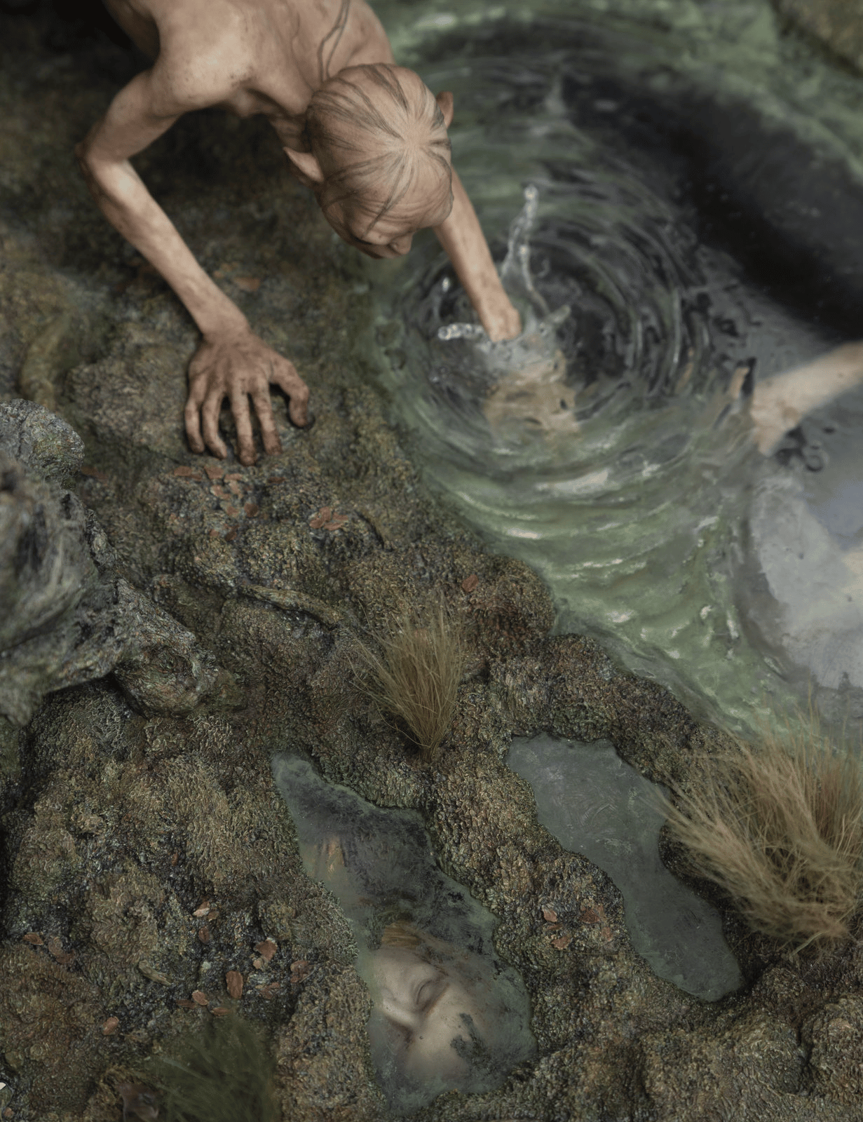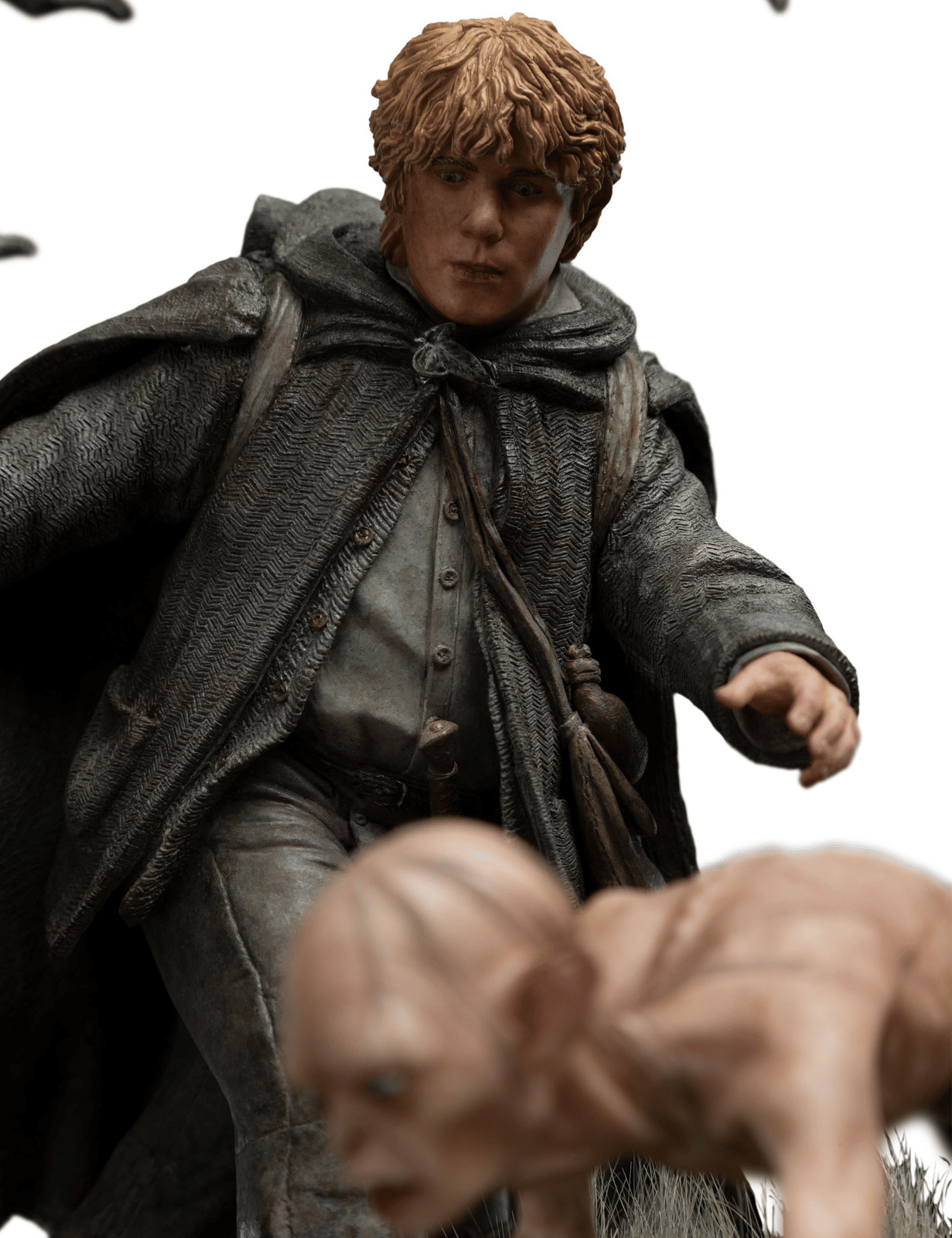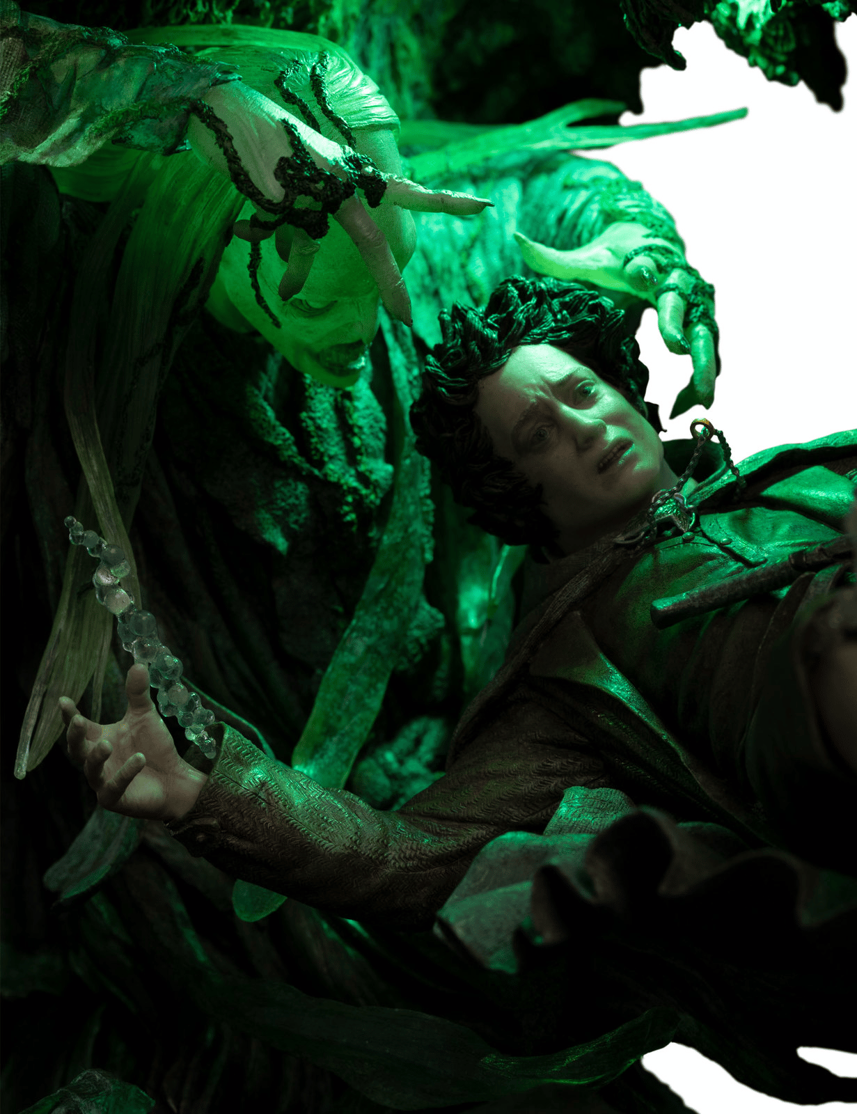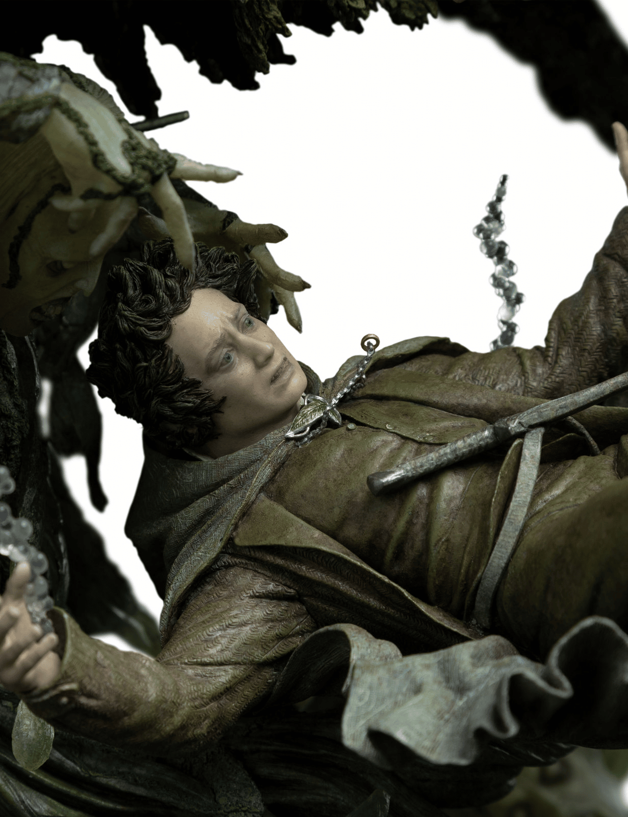Capitalizing on the environment’s mystical nature, and undead spirits haunting the waters below, we wanted to display the two worlds that often overlap in Middle-earth: the magical and the mundane. Above the waters, Sam and Gollum desperately reach out to rescue the sinking Hobbit. Below the waters, wraiths pull Frodo further into the depths. Representing those two contrasting worlds in one scene proved pivotal in creating this collectible.