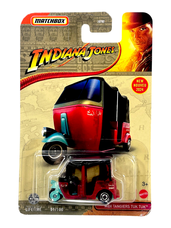 DESCRIPTION: This Matchbox MBX Tangiers Tuk Tuk from the Indiana Jones line recreates the memorable vehicle seen in the film franchise. With authentic detailing and themed packaging, it blends classic movie nostalgia with Matchbox’s realistic die-cast design. A great collectible for both Indiana Jones fans and Matchbox vehicle collectors.