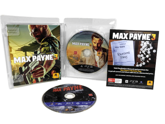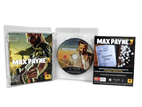 RARE FIND: MINT Condition (presents AS New) & 100% Complete with Contents: MAX PAYNE 3 for SONY PlayStation 3 / PS3. This game is in pristine condition – a very tidy collector’s item, and comes complete with case, cover, manual / booklet, game disc, plus Special Bonus Max Payne movie DVD disc.