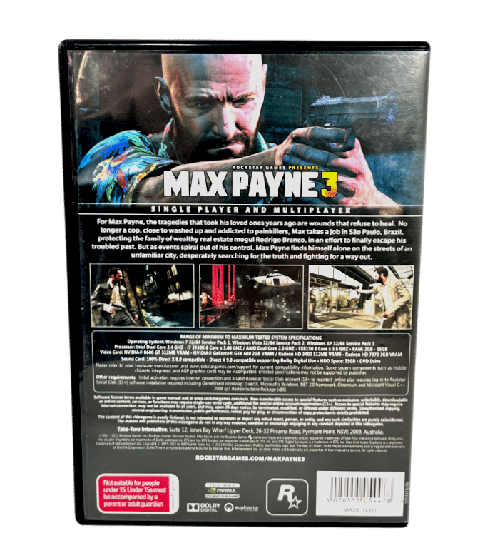 Excellent condition & 100% complete with contents: Max Payne 3 for PC. This preowned PC game comes complete with case + cover + booklet + 4 x game discs. Please Note that as a preowned PC game, this game may require a new Steam Code purchased online in order to activate the game.