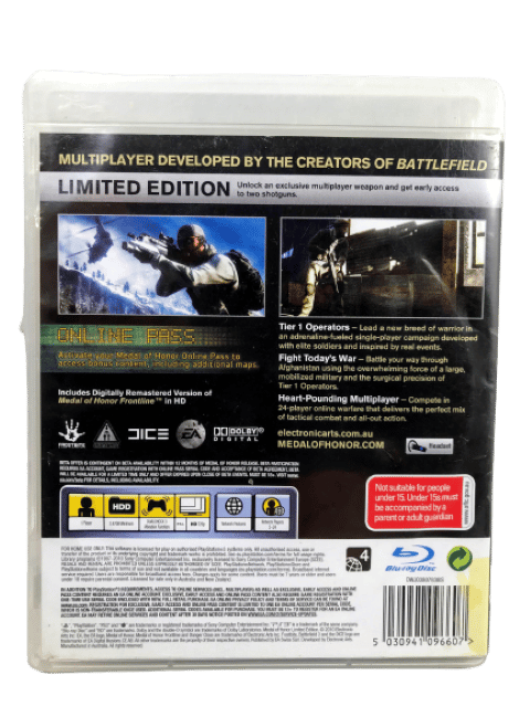 Excellent condition & 100% complete with contents: MEDAL OF HONOR / MEDAL OF HONOUR for SONY PlayStation 3 / PS3. This preowned game comes complete with case + cover + manual / booklet + game disc. Case has some mild laminate plastic wear, but this is purely cosmetic, and each of the internal contents are superb.