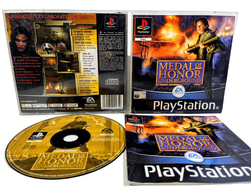The Original Print (non-Platinum) edition in excellent condition & 100% complete with contents: MEDAL OF HONOUR UNDERGROUND for SONY PlayStation / PS1. This preowned game is in superb condition and comes complete with case + covers (both front + reverse cover slips) + manual / booklet + game disc. The booklet has partially stuck to the back of the front cover, but could be separated with care and is still able to be read in its entirety.