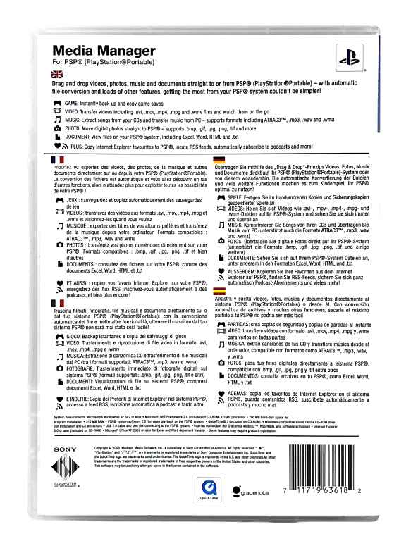 Excellent condition & 100% complete with contents: MEDIA MANAGER for SONY PSP / PlayStation Portable. This preowned rare release is in superb condition and comes complete with LARGE (full sized) case + cover + manual / booklet + game disc. Refer photographs.