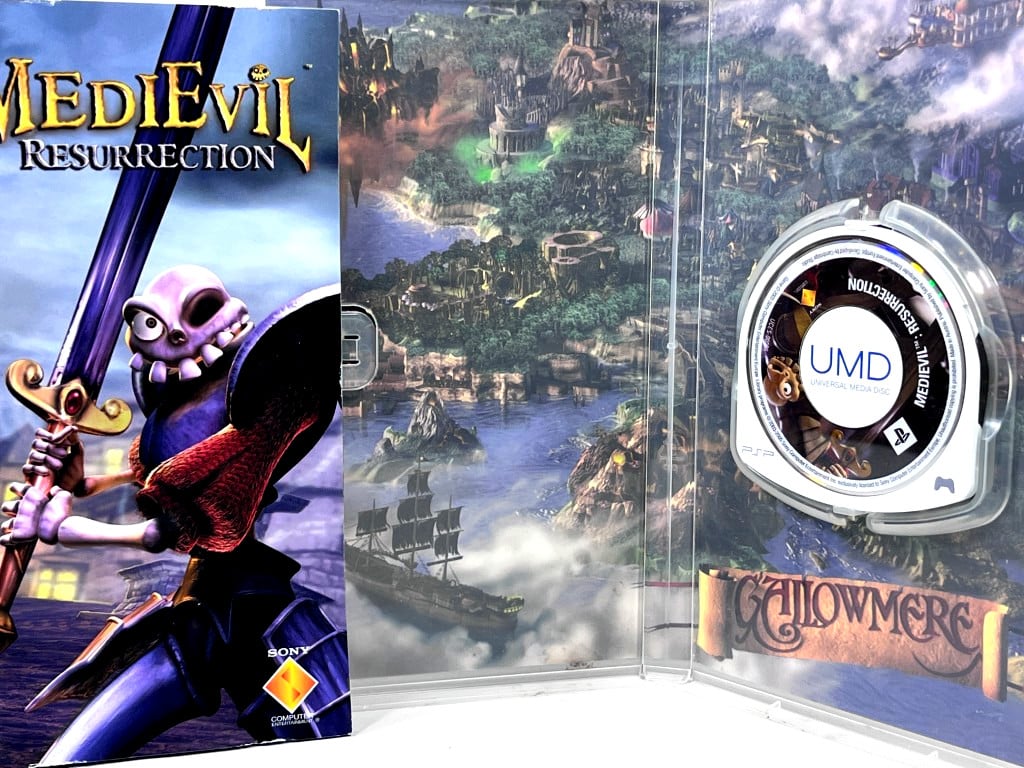 Genuine Original Print in excellent condition & 100% complete with contents: Medievil Resurrection for SONY PSP / PlayStation Portable. This preowned game comes complete with case + cover + manual / booklet + game disc inside its miniature UMD case. Top of booklet has some very minor paper fraying, but this is purely cosmetic.