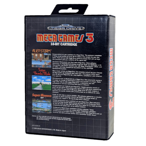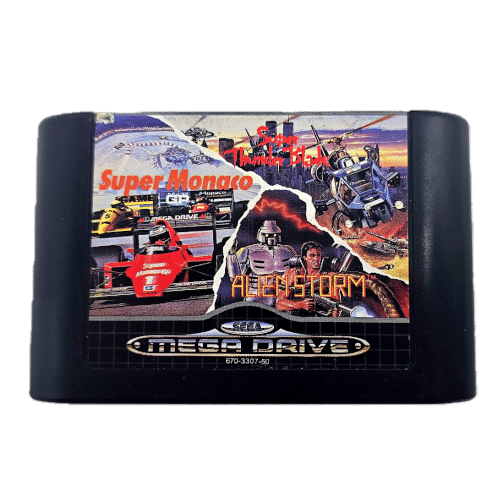 Mega Games 3 for the Sega Mega Drive (Genesis) is a compilation cartridge released in 1993. It brings together three popular racing/action style games in one package: Super Thunder Blade, Super Monaco and Alienstorm.