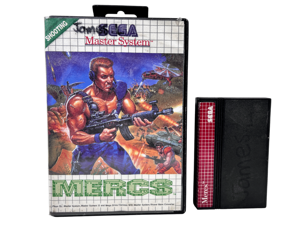 MERCS for Sega Master System. Preowned game includes pictured case + cover + game cartridge. Has previous owner’s name written on the case which can be wiped off with cleaning product.
