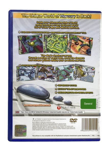 Mercury Meltdown Remix lets you take control of the little Mercury ‘blob’ from the original Mercury Meltdown. Players must avoid various obstacles and hazards to reach the end goal. The Mercury blob itself has now been given an overhaul and has 4 varying states: Normal, Solid, Fast and Slow. These states allow for larger more complex levels, which in turn mean a greater challenge and more enjoyment to be had for the player. Fairer Game progression Super Fast load times Tutorial Mode Downloadable content Game Share 5 New Mini-Games – Stretch your brain with Metrix! Aim for the target with Shove! Beat your rivals in Space! Use tactics and strategy in Paint! Test your balance in Rodeo! Mercury Meltdown Remix for the PS2 brings an amazing amount of control to the camera and blob by use of both analog sticks on the dualshock controller. The control is unbelievably intuitive allowing for full concentration on the mind-tingling levels themselves.