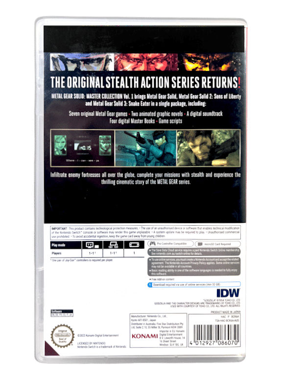 Metal Gear Solid Master Collection Vol. 1 (Nintendo Switch). This preowned game is in excellent condition and complete with original case + cover + game cartridge. The paper voucher card is not included, but this was a promotional download only and is not required for gameplay or completion. The Full Metal Gear Solid Master Collection Volume 1 is included on the game cartridge.
