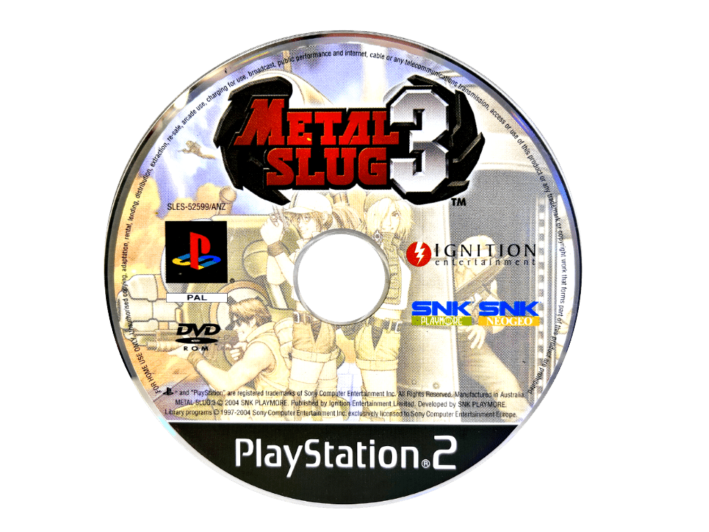 METAL SLUG 3 for SONY PlayStation 2 / PS2. GENUINE PAL Edition (NZ Region) – RARE PS2 Game disc in good condition with only light markings and faint ghost scratches. This preowned disc comes inside an empty blank case. Please note that the original case is NOT included.