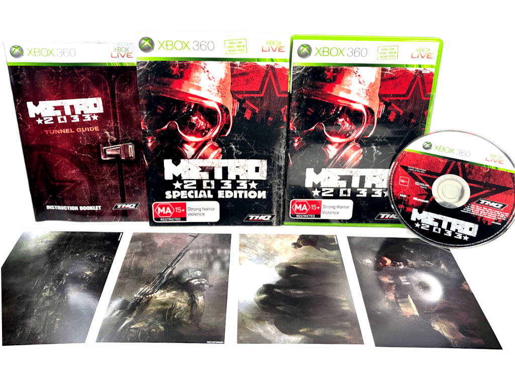 Rare BOXED Edition in Excellent condition & 100% complete with contents including Collector’s Cards): METRO 2033 The Video Game for XBox 360. This preowned boxed edition is in superb condition and comes complete with Box + case, cover, manual / booklet, game disc, + 4 x pictured collector’s cards. The disc has some light superficial markings / cosmetic scratches, but these are very minor imperfections which do not affect game play in any way. Overall, a very tidy collector’s bundle. Refer photographs.