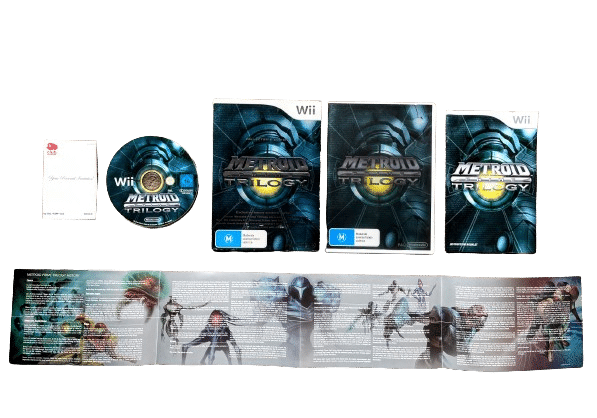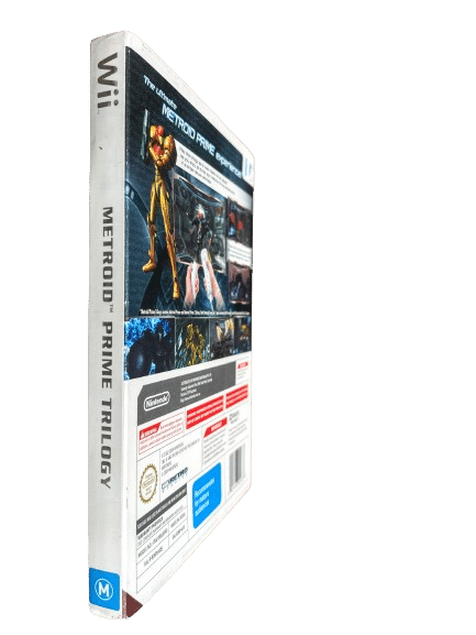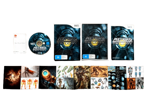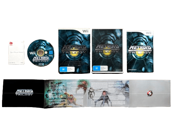 RARE BOXED Limited Collection in excellent condition & 100% complete with contents: The METROID PRIME TRILOGY for Nintendo Wii. This preowned trilogy is the Official NZ Release – in superb condition and comes complete with collector’s box + game case, genuine New Zealand Cover (with the signature “M” Classification embedded in the cover art), manual / booklet, Special insert detailing the story and art of the Metroid Prime Trilogy, and game disc. Outer display box has some minor paper fraying along the very bottom edge, but this is purely cosmetic, and each of the internal contents are fantastic. Overall, a tidy and complete collector’s item.