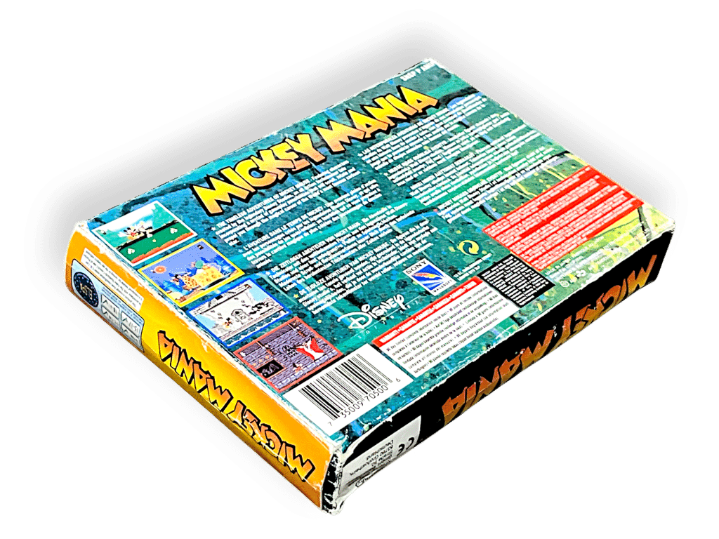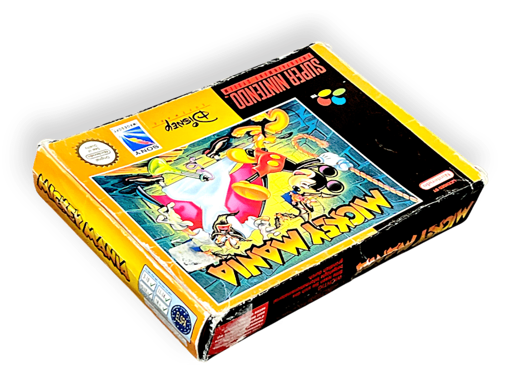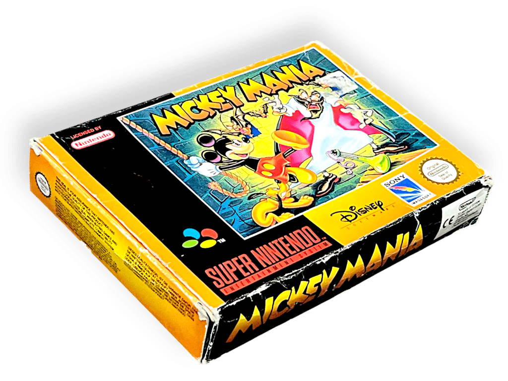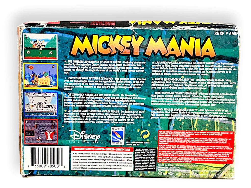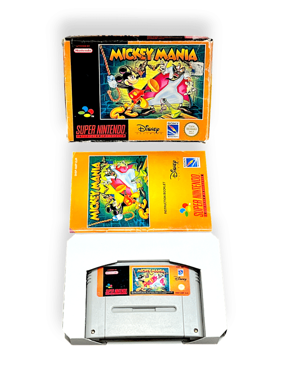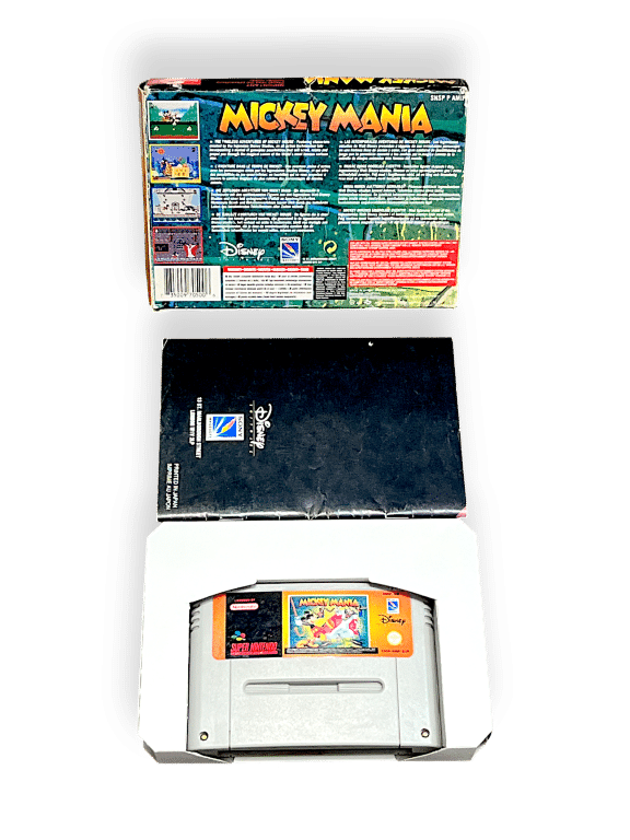 RARE PAL EDITION complete with box: Mickey Mania: The Timeless Adventures of Mickey Mouse (Super Nintendo Entertainment System SNES – CIB). This pre-owned SNES game is in good condition and includes pictured box and contents, a complete collector’s item with minor shelfware to the box, refer photographs.