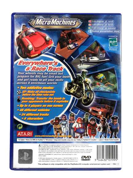 Excellent condition & 100% complete with contents: MICRO MACHINES / MICROMACHINES / MICRO-MACHINES for SONY PlayStation 2 / PS2. This preowned game is in superb condition with only the mildest of disc surface imperfections, and comes complete with case, cover, manual / booklet, and game disc.