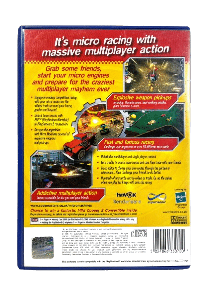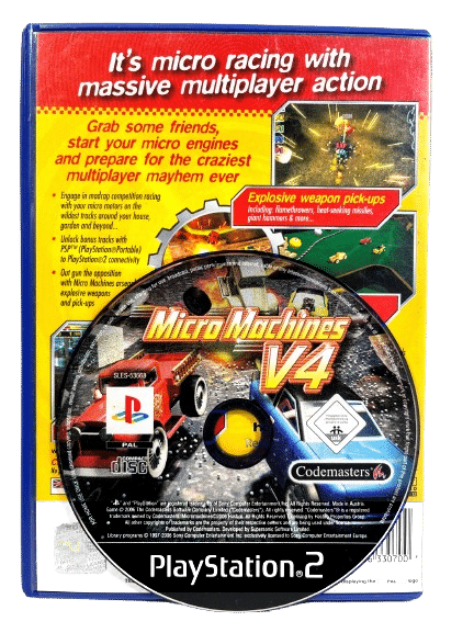 RARE Children’s / Family Driving & Racing Game in excellent condition & 100% complete with contents: MICROMACHINES V4 / MICRO-MACHINES V4 / MICRO MACHINES VERSION 4 for SONY PlayStation 2 / PS2. This preowned game comes complete with case, cover, manual / booklet, and game disc.