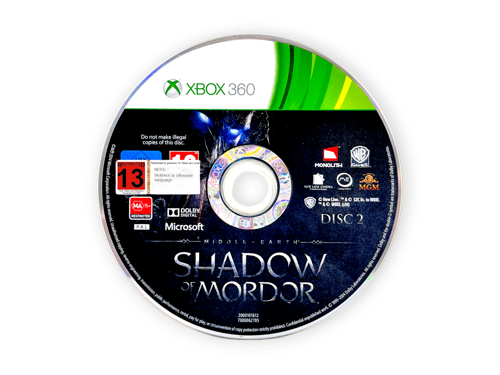 Middle-Earth: Shadow of Mordor – Disc 2 (Xbox 360) *DISC 2 ONLY*. This preowned Xbox 360 game disc is in good condition with only light markings and faint scratches only. Note that this is DISC 2 ONLY (DISC 1 IS NOT INCLUDED – AND DISC 1 IS REQUIRED TO PLAY THE FULL GAME). This game disc comes inside an empty blank case. Please note that the original case is not included.