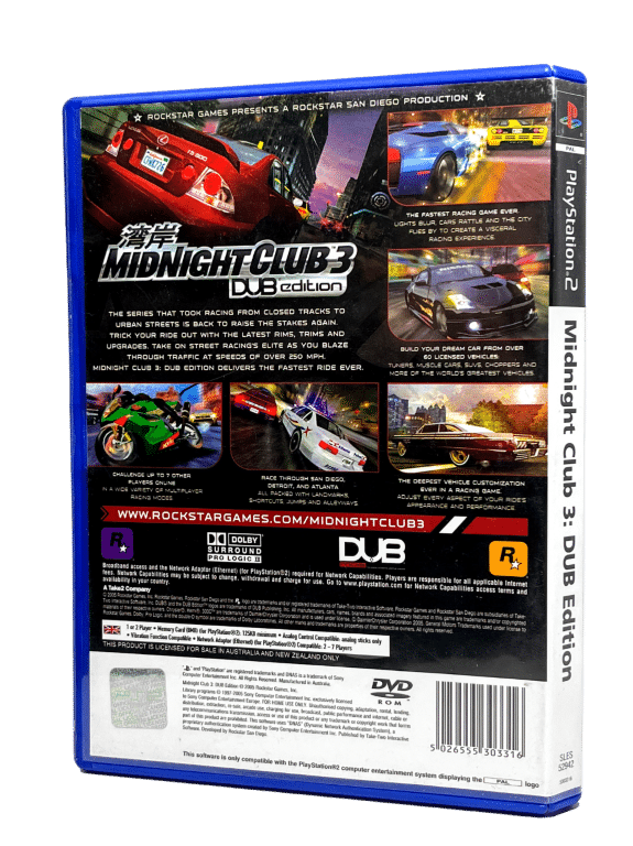The rare Original “BLACK” Edition in Good Condition & 100% complete with contents: MIDNIGHT CLUB 3 DUB EDITION THE ORIGINAL GAME for SONY PlayStation 2 / PS2. This preowned game disc is in excellent condition and comes complete with Genuine Original Print SONY PlayStation 2 case, cover, and manual / booklet. Advertising card not included. The booklet has some light paper creasing, but this is purely cosmetic.
