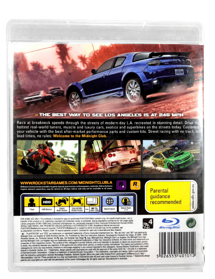 Mint condition & complete with manual: Midnight Club Los Angeles – the original game in the original print disc – for SONY PlayStation 3. This preowned game is a tidy and complete collector’s item – with original case + cover + manual / booklet + game disc.