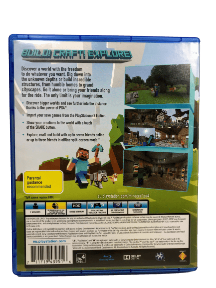 MINECRAFT for SONY PlayStation 4 / PS4. This preowned game is in excellent condition and complete with case + cover + promo card + game disc.