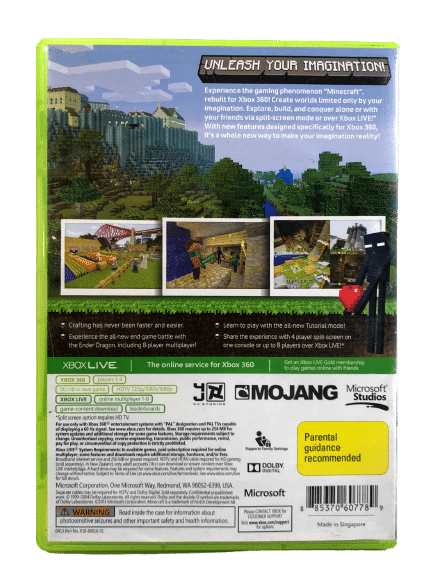 Imagine it, build it! Minecraft for Xbox 360 lets to create worlds from the comfort of your sofa. Play allow or play with friends. Explore, build and conquer! At night monsters come out, so make sure to build a shelter before that happens. After that, your world is your imagination. Turn hours into minutes with Minecraft for Xbox 360!