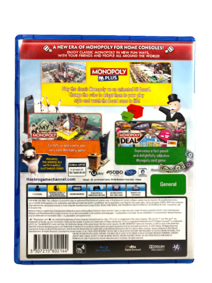 Excellent condition & 100% complete with contents: The MONOPOLY Family Fun Pack for SONY PlayStation 4 / PS4. This preowned game is in excellent condition and includes case, cover, manual / booklet, and game disc. The paper cover has a gentle water mark, but this is an extremely minor imperfection, and the contents inside – game disc + manual – are each in superb condition.