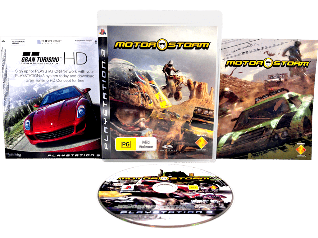 MOTORSTORM / Motor Storm The Video Game for SONY PlayStation 3 / PS3. This preowned game disc is in excellent condition and includes original case + cover instruction manual / booklet.