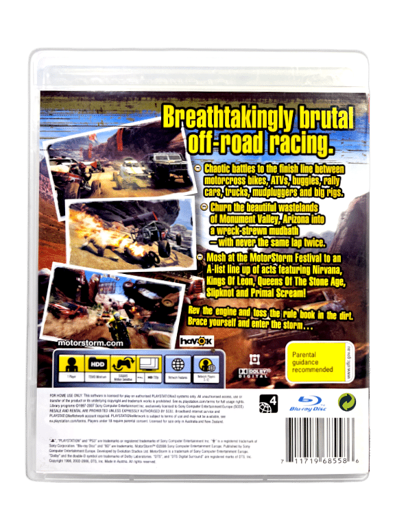 - PLAYSTATION 3 – Greater processing power on PlayStation 3 and Blu-ray technology enables more immersive visuals and sound effects in MotorStorm, heightening the chaos within each brutal race environment.