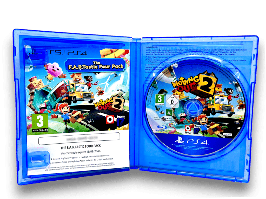 Rare PS4 Edition in Excellent condition & 100% complete with contents: Moving Out for SONY PlayStation 4 / PS4. This preowned game comes complete with case, cover, carded insert, and game disc. Any single use paper vouchers will have expired, but these were promotional downloads only and are not required for gameplay or completion. The full Moving Out 2 game is included on the game disc.