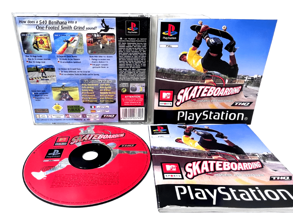 Good condition & 100% complete with contents: MTV Sports: Skateboarding Featuring Andy MacDonald for SONY PlayStation Game / PS1. This preowned game comes complete with case + covers (both front & reverse cover slips) + manual / booklet + game disc. The front plastic panel of the case has a piece missing off the corner, and the disc some very faint superficial markings / cosmetic scratches, but these are purely cosmetic and do not affect game play in any way.
