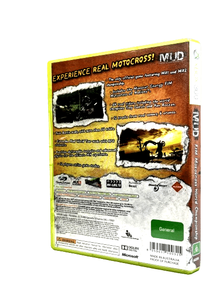 Genuine NZ Edition – Rare Driving & Racing Game in Excellent Condition & 100% Complete with Contents: MUD FIM MOTOCROSS WORLD CHAMPIONSHIP for XBox 360. This preowned game is in superb condition and comes complete with case, Authentic New Zealand Release Cover (with the signature “G” Classification embedded in the cover art and on the game disc), manual / booklet, and game disc.