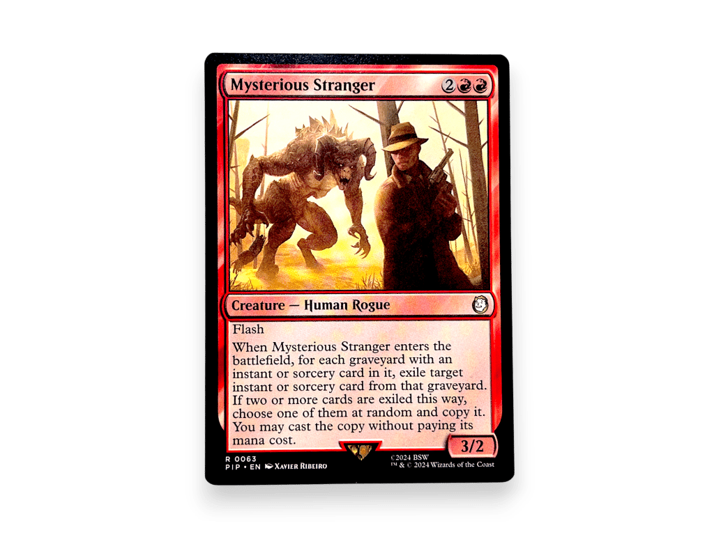 A reactive Human Rogue with flash that exiles instants or sorceries from graveyards when entering the battlefield. If two or more cards are exiled, you can cast one for free, giving strong tempo and control value. Its eerie horror-inspired artwork makes this card a standout from the Universes Beyond series.