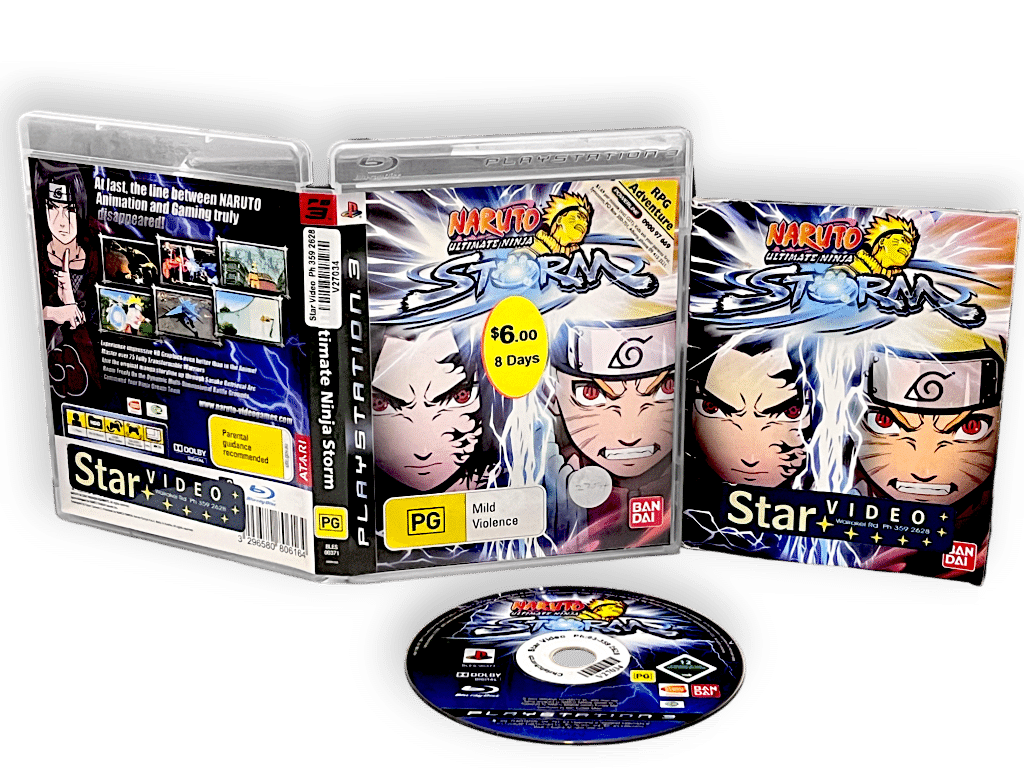 Naruto: Ultimate Ninja Storm (PS3) *COMPLETE*. This pre-owned Sony PlayStation 3 game is in good condition and complete with pictured X rental case, cover, Instruction Manual / Booklet, and game disc.